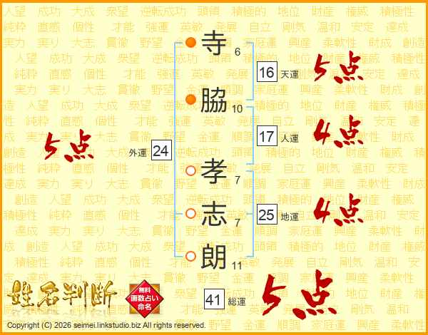 寺(6画)脇(10画) 孝(7画)志(7画)朗(11画)