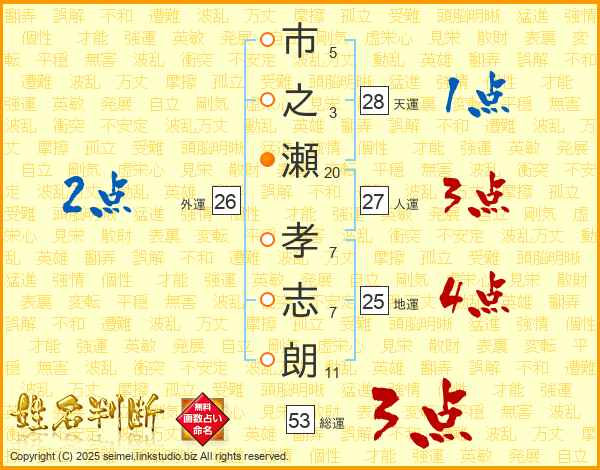 市(5画)之(3画)瀬(20画) 孝(7画)志(7画)朗(11画)
