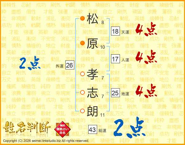松(8画)原(10画) 孝(7画)志(7画)朗(11画)