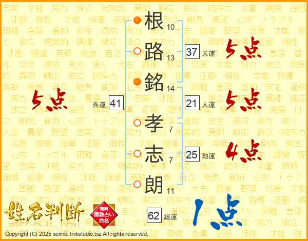 根(10画)路(13画)銘(14画) 孝(7画)志(7画)朗(11画)