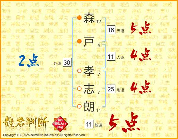 森(12画)戸(4画) 孝(7画)志(7画)朗(11画)