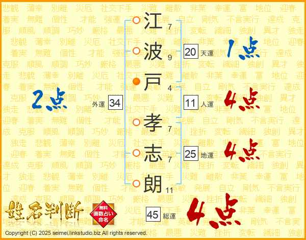 江(7画)波(9画)戸(4画) 孝(7画)志(7画)朗(11画)