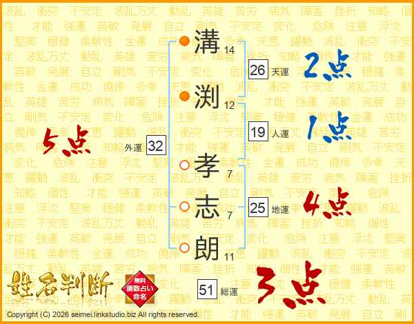 溝(14画)渕(12画) 孝(7画)志(7画)朗(11画)