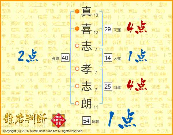 真(10画)喜(12画)志(7画) 孝(7画)志(7画)朗(11画)