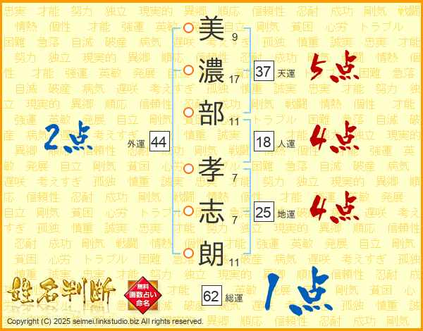 美(9画)濃(17画)部(11画) 孝(7画)志(7画)朗(11画)
