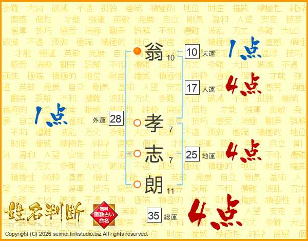 翁(10画) 孝(7画)志(7画)朗(11画)
