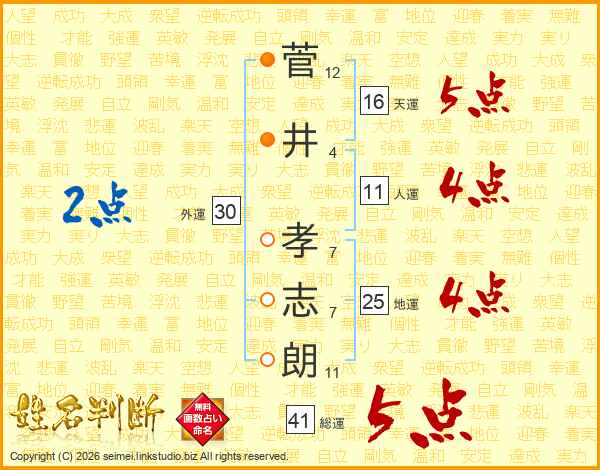 菅(12画)井(4画) 孝(7画)志(7画)朗(11画)