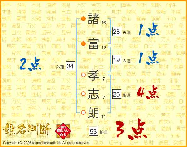 諸(16画)富(12画) 孝(7画)志(7画)朗(11画)