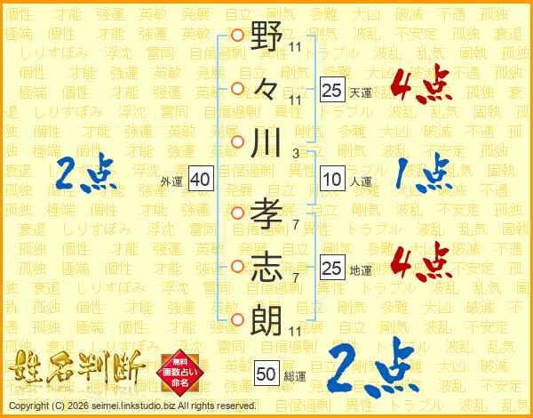 野(11画)々(11画)川(3画) 孝(7画)志(7画)朗(11画)