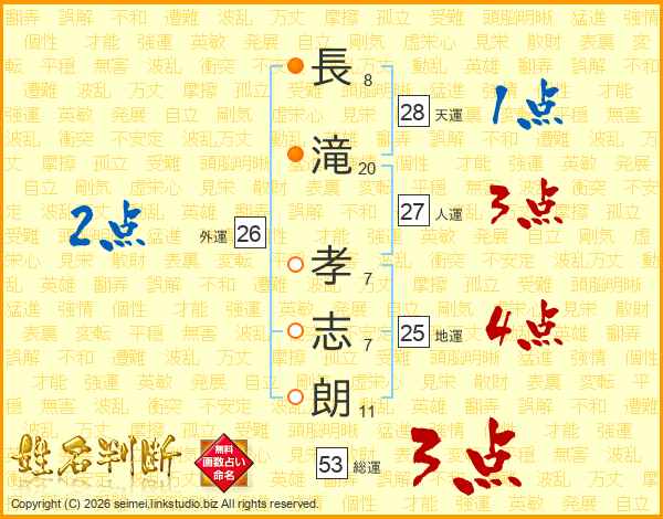 長(8画)滝(20画) 孝(7画)志(7画)朗(11画)