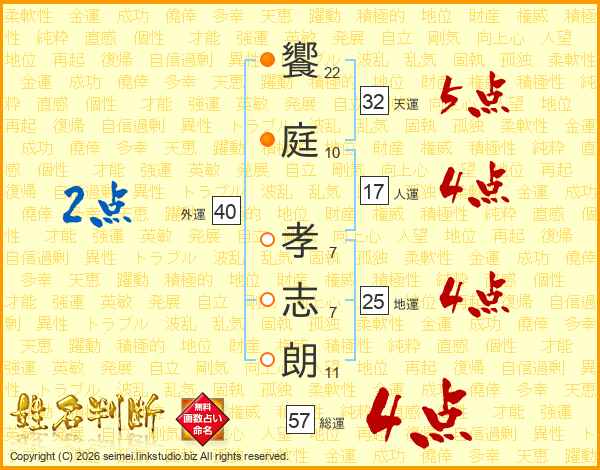 饗(22画)庭(10画) 孝(7画)志(7画)朗(11画)