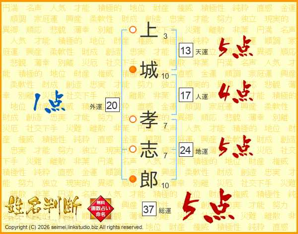 上(3画)城(10画) 孝(7画)志(7画)郎(10画)