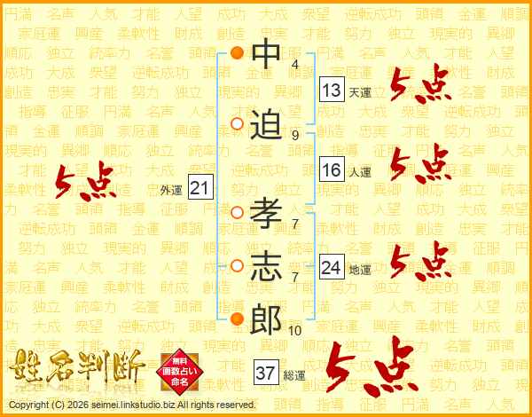 中(4画)迫(9画) 孝(7画)志(7画)郎(10画)