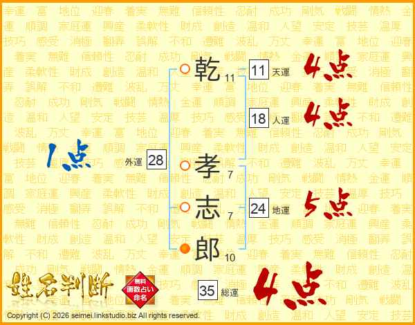 乾(11画) 孝(7画)志(7画)郎(10画)