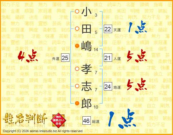 小田嶋孝志郎さんの総運は46画の1点!