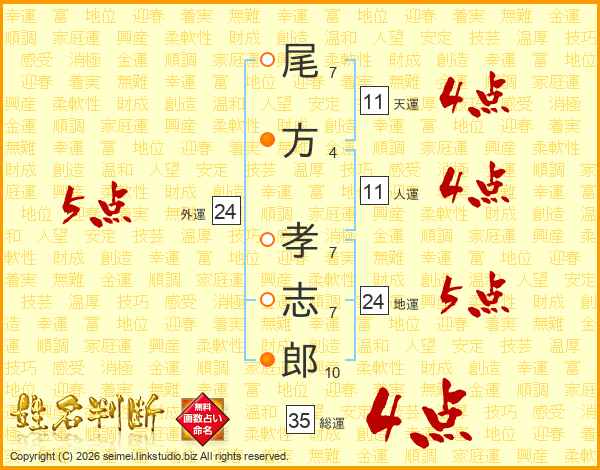 尾(7画)方(4画) 孝(7画)志(7画)郎(10画)