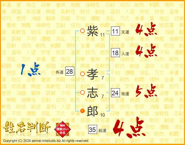 紫(11画) 孝(7画)志(7画)郎(10画)