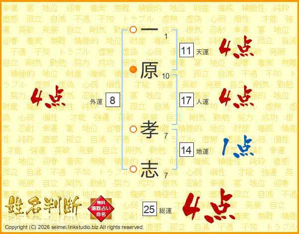 家系が持つ宿命的な運勢を表します。祖先から受け継いだ苗字ですので自分の力が及びません。家柄を象徴します。苗字の合計画数。