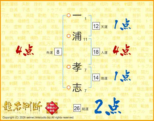 あなたの人生を表す1番重要な運勢です。生涯を通じて影響する総合運となり、主に50歳以降の晩年期に影響を及ぼします。苗字と名前の合計画数。