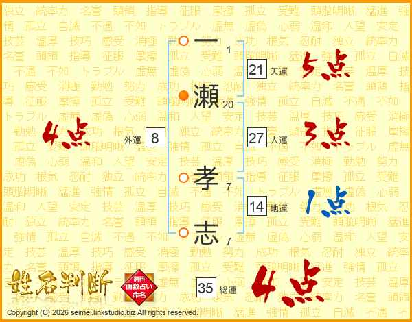 一(1画)瀬(20画) 孝(7画)志(7画)
