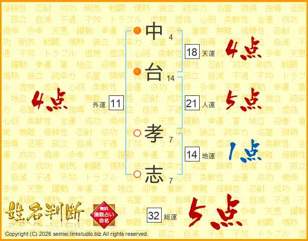 家系が持つ宿命的な運勢を表します。祖先から受け継いだ苗字ですので自分の力が及びません。家柄を象徴します。苗字の合計画数。
