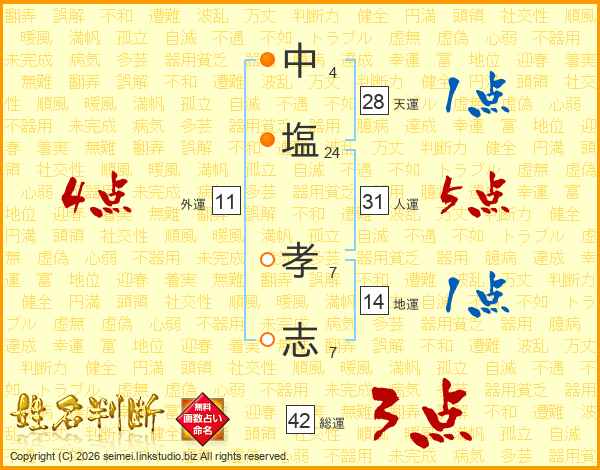 中(4画)塩(24画) 孝(7画)志(7画)