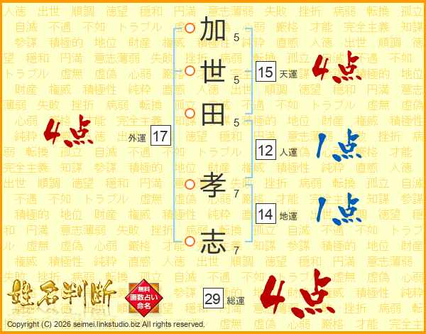 加(5画)世(5画)田(5画) 孝(7画)志(7画)