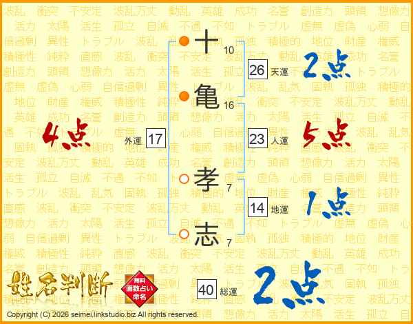 画数の奇数(○陽)と偶数(●陰)の配列で吉凶を占います。どちらかにかたよる名前は大凶名で避ける必要があります。画数の奇数偶数。