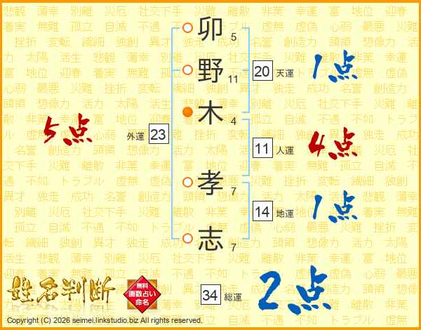 卯野木孝志さんの総運は34画の2点!