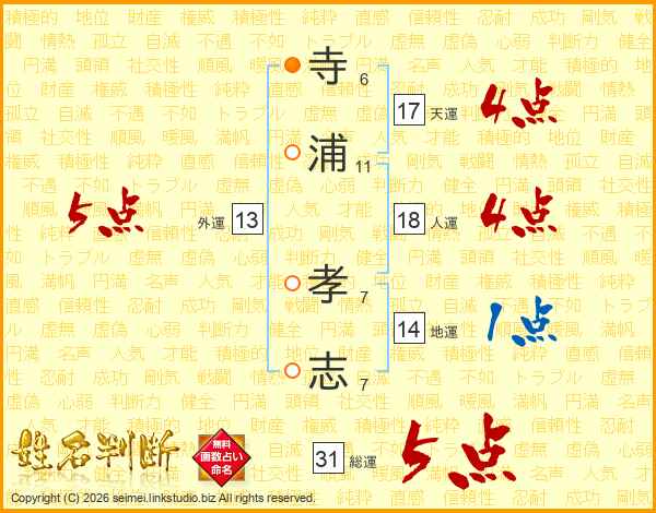 寺(6画)浦(11画) 孝(7画)志(7画)