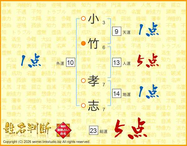 小竹孝志さんの総運は23画の5点!