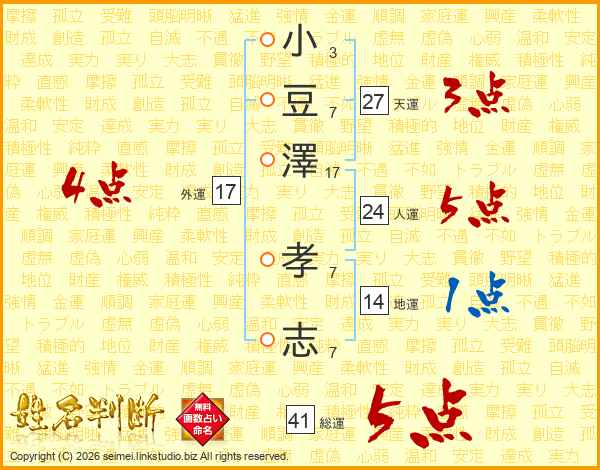 小(3画)豆(7画)澤(17画) 孝(7画)志(7画)