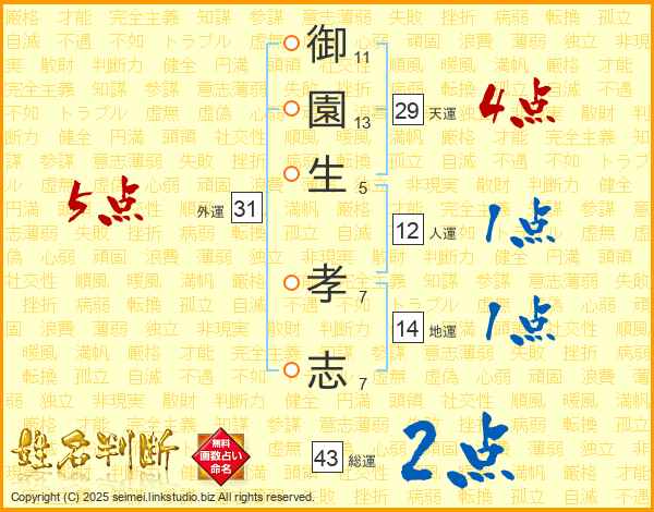 御(11画)園(13画)生(5画) 孝(7画)志(7画)