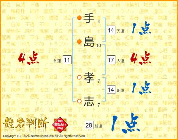 手(4画)島(10画) 孝(7画)志(7画)