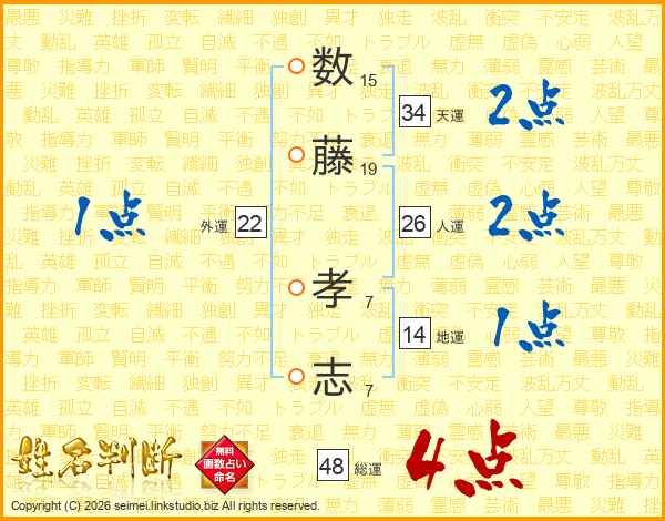 あなたの人生を表す1番重要な運勢です。生涯を通じて影響する総合運となり、主に50歳以降の晩年期に影響を及ぼします。苗字と名前の合計画数。