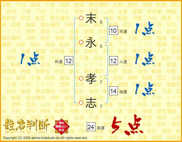 生活面を象徴する運勢です。外部から受ける影響力を表し、結婚運、家庭運や職場、環境への順応性を表します。総運から人運を引いた画数。姓や名が1文字の場合を除く。