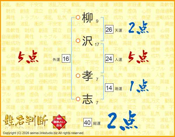 柳(9画)沢(17画) 孝(7画)志(7画)
