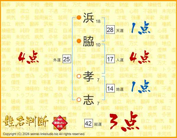 浜(18画)脇(10画) 孝(7画)志(7画)