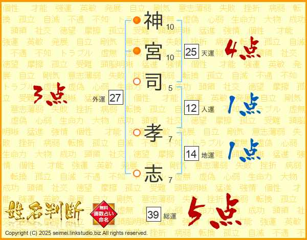 神(10画)宮(10画)司(5画) 孝(7画)志(7画)