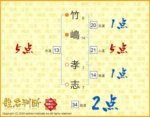 竹(6画)嶋(14画) 孝(7画)志(7画)
