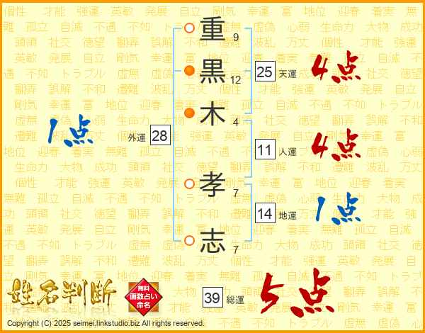 重(9画)黒(12画)木(4画) 孝(7画)志(7画)