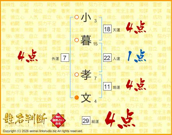 家系が持つ宿命的な運勢を表します。祖先から受け継いだ苗字ですので自分の力が及びません。家柄を象徴します。苗字の合計画数。
