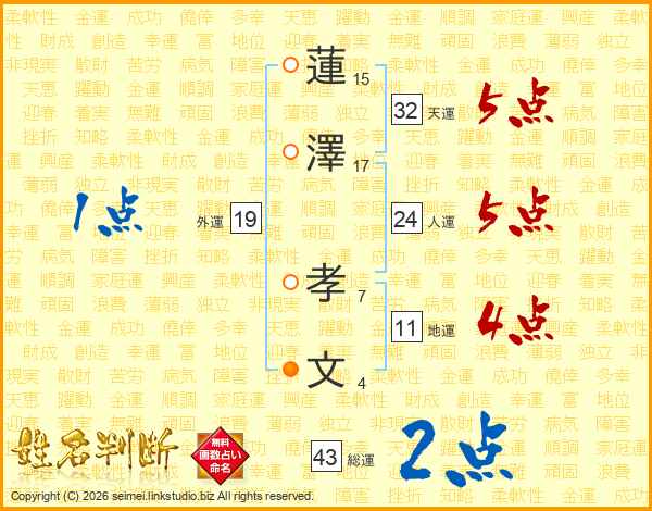蓮(15画)澤(17画) 孝(7画)文(4画)