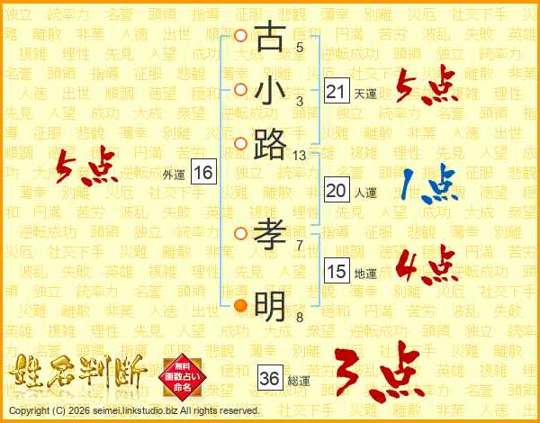 古(5画)小(3画)路(13画) 孝(7画)明(8画)