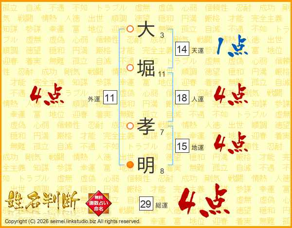 大(3画)堀(11画) 孝(7画)明(8画)