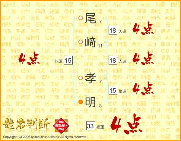 尾(7画)﨑(11画) 孝(7画)明(8画)