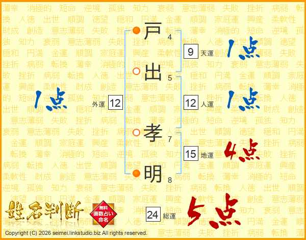 家系が持つ宿命的な運勢を表します。祖先から受け継いだ苗字ですので自分の力が及びません。家柄を象徴します。苗字の合計画数。