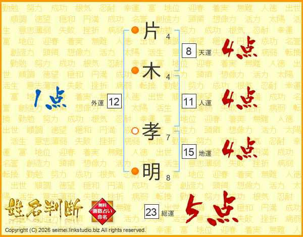片(4画)木(4画) 孝(7画)明(8画)
