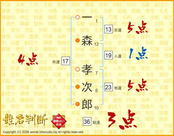 一(1画)森(12画) 孝(7画)次(6画)郎(10画)