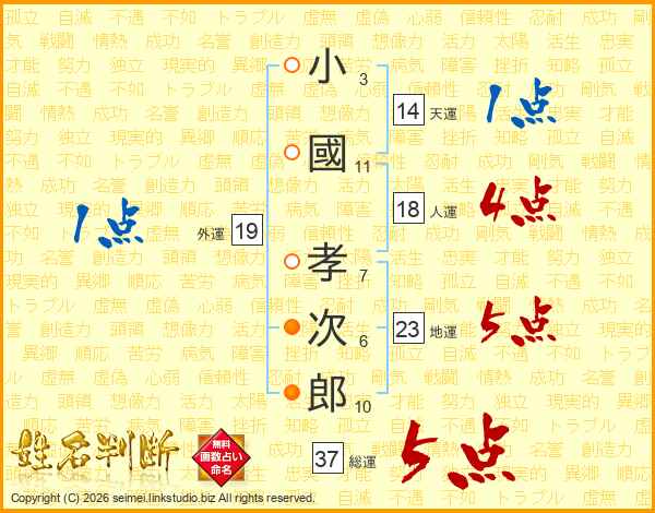 小(3画)國(11画) 孝(7画)次(6画)郎(10画)